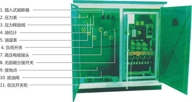 該產(chǎn)品將高壓負荷開關、高壓熔斷器置于變壓器油中,具有與變壓器器身共箱或分箱兩種結構形式。油箱采用全密封結構,配有油溫表、油位表、壓力表、壓力釋放閥、放油閥等元件以監(jiān)測變壓器運行狀況。該產(chǎn)品分為環(huán)網(wǎng)型、終端型及電源型供電方式。為了使此種產(chǎn)品更適合于我國電網(wǎng)的實際要求,公司又推了插拔型干式熔斷器,熔絲的熔斷不影響變壓器油的性能。根據(jù)低壓饋出要求的復雜程度,YBM-12/0.4型產(chǎn)品分為標準型、加強型和綜合型三種外殼形式,使用戶和設計單位在選型時,做到更靈活、更經(jīng)濟。